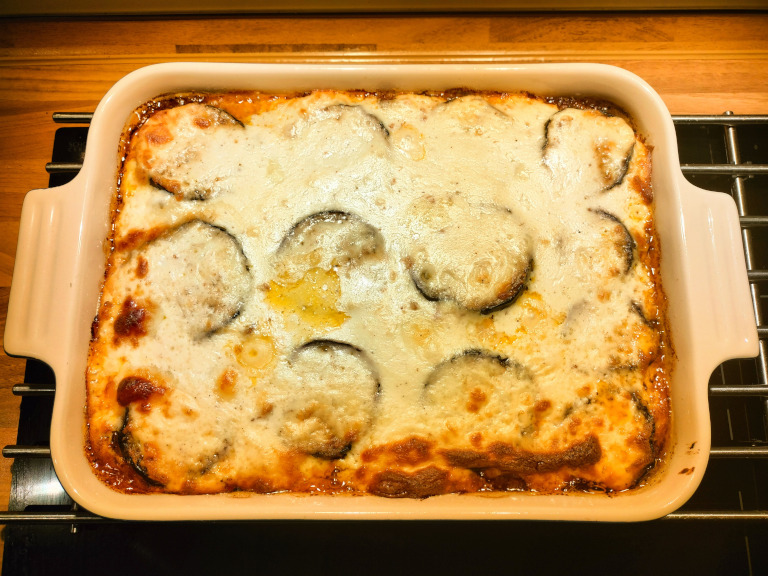 auberginerne. De resterende aubergineskiver fordeles oven på saucen og afslut med en portion ostesauce.
