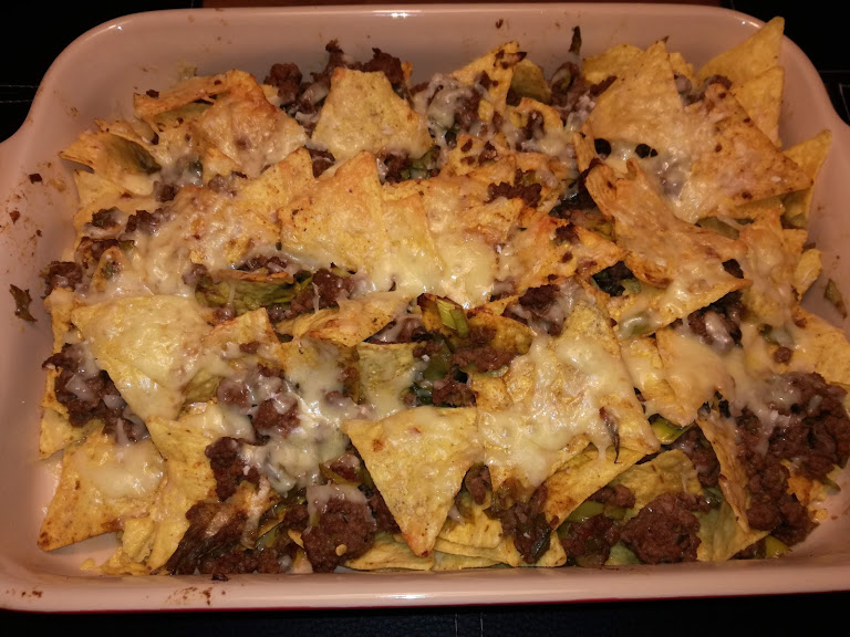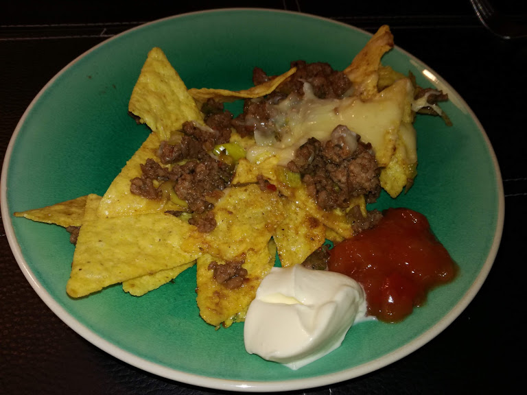 Nachos fordeles i 4 mindre ildfaste fade eller lignende. Kødet fordeles ovenpå disse, creme fraîchen fordeles ovenpå og til sidst slutter man af med at fordele osten.