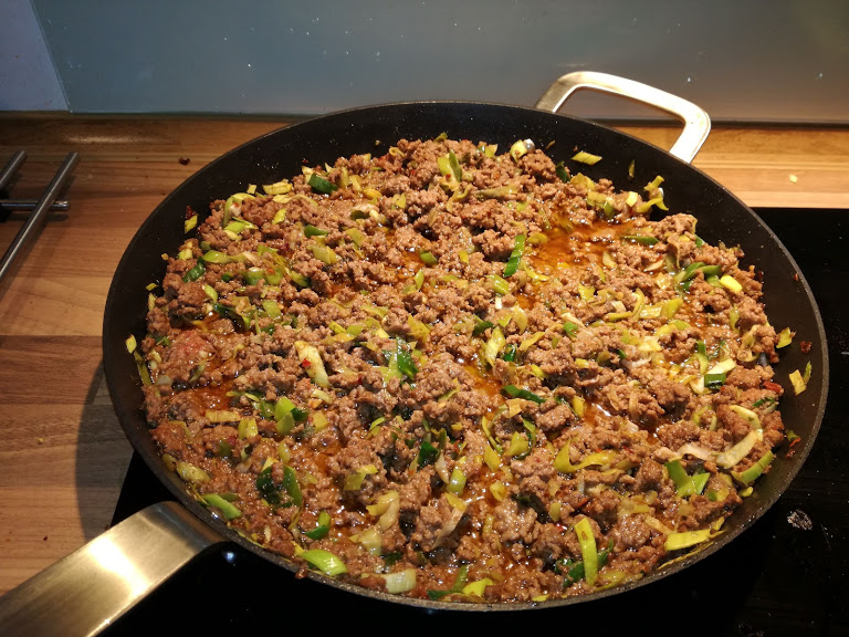 Porre tilsættes og kødet steger i yderligere 2 min.