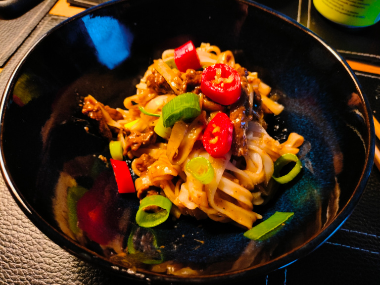 Oksekødet føres tilbage i wokken, og varme igennem, hvorefter nudlernes tilsættes og vendes rundt i saucen.