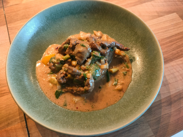 Når kødet er mørt, tilsættes fløden og gives et opkog.