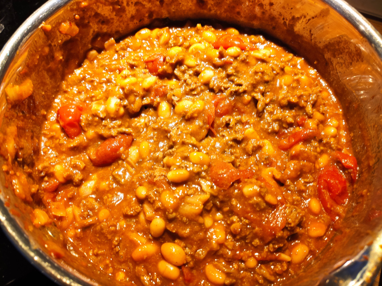 Farsen tilsættes og brunes. Cherrytomaterne og bønner tilsættes og når al væden er fordampet er køde-fyldet færdigt.