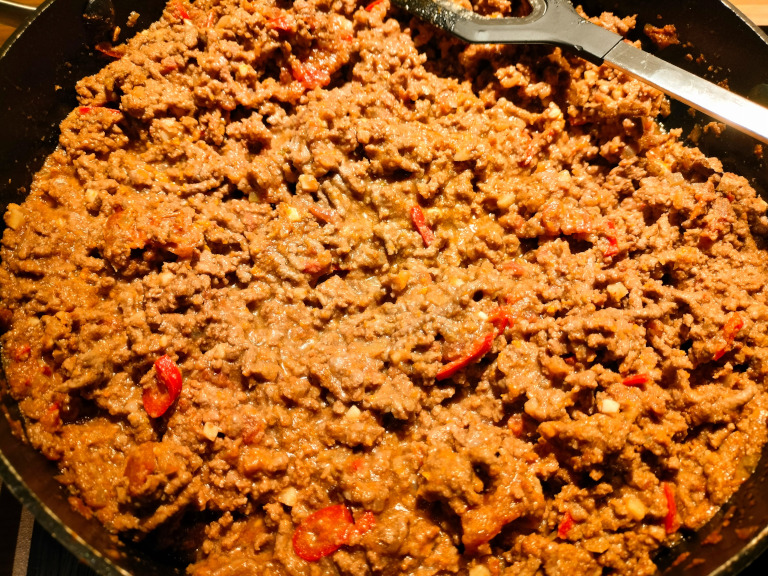Farsen tilsættes og brunes. Vandet tilsættes og når al væden er fordampet er kødet færdigt.