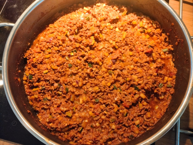 Hakkede tomater tilsættes, og når al væden er fordampet, er køde-fyldet færdigt.