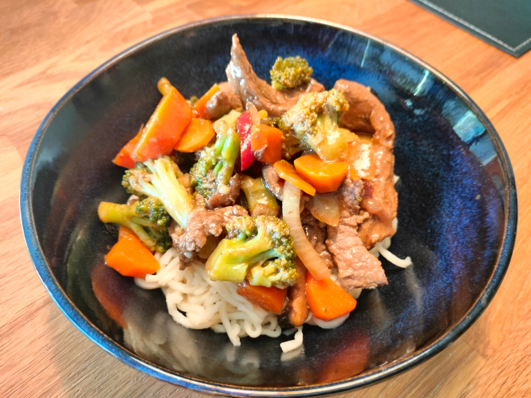 Grøntsagerne: rapsolie 1 løg, skåret i skiver 300 g broccoli, i små buketter 200 g gulerødder, i tern 1 dåse bambusskud 1 spsk. sherry