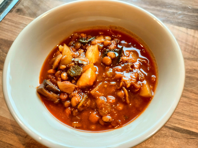 Tilsæt nu bouillon, tomatpure, soja og linserne. Rør godt rundt og giv et opkog.