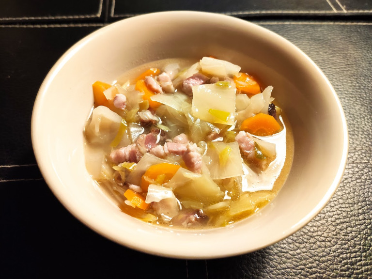 Resten af ingredienserne tilsættes og suppen koger - under låg - i ca. 1 time.