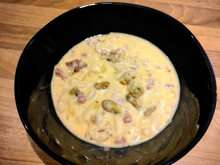 Muslingerne tilsættes og suppen varmes godt op uden at koge. Klar til servering.
