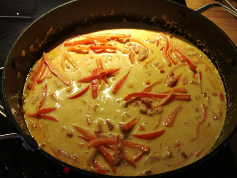 Bacon, løg, hvidløg og krydderierne svitses godt, tilsæt evt. lidt olie.