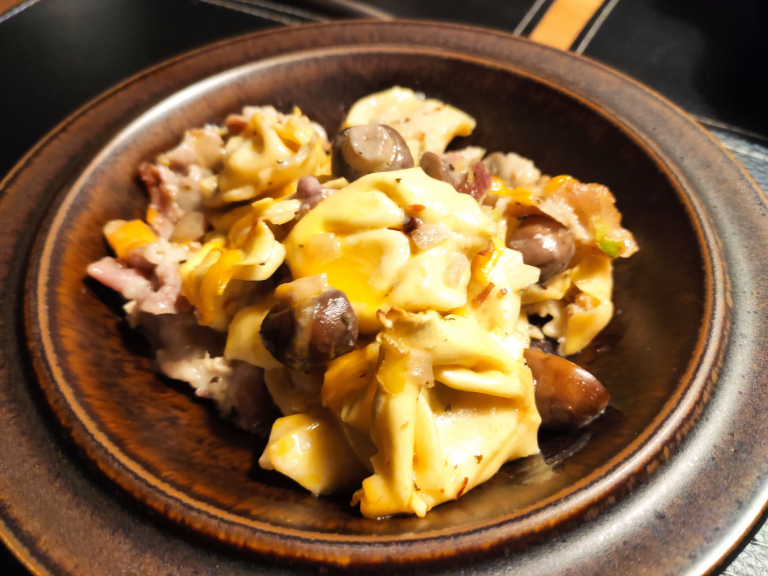 Den kogte tortellini røres i saucen, og det hele hældes over i et ovnfast fad. Cheddar osten drysses over og retten gratineres i ovn ved 180° i 15-20 min.
