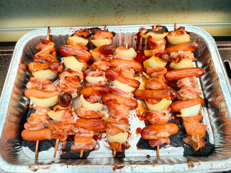 Kød, bacon, pølser og løg sættes skiftevis på spyddene