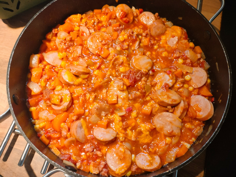 bacon, majs, tomater tilsættes og retten bringes i kog.