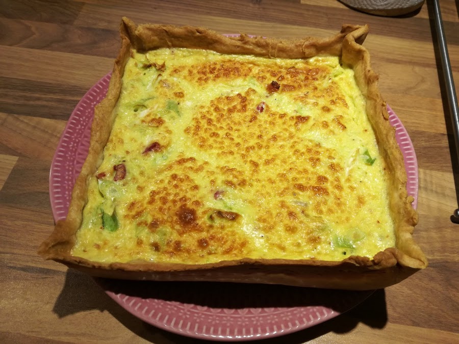 Alle ingredienserne blendes godt sammen og hældes over forårsløg og bacontern og quichen bages ved 200° i 30-35 min (eller indtil æggemassen er fast).