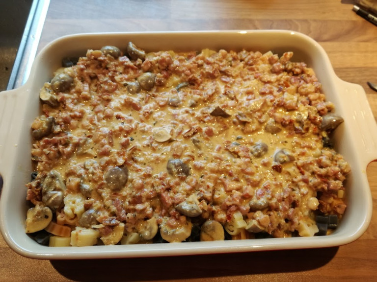 Den udvalgte pasta kan evt. efter kogning tilsættes sammen med fløden. Vend godt rundt og serveres når den er rygende varm.