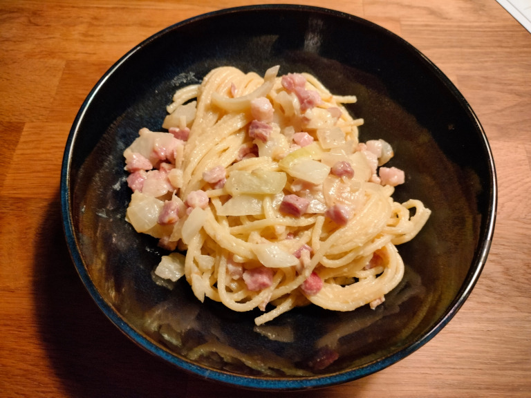 Spaghettien hældes ned til fyldet, saucen hældes over og pastavandet hældes ved. Det hele blandes godt med 2 gafler (som hvis det var en salat), og serveres evt. med ekstra ost ved siden af - til at drysse over.