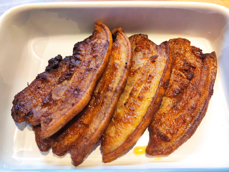 Flæskeskiverne steges indstil sprøde ved 180°, husk at vende.