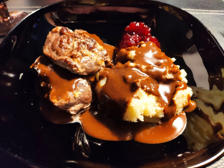 Bouillon, sherry og fløde hældes ved, låg på stegesoen og steges i ovn ved 140° i 2½-3 timer - indtil kødet er super mørt.