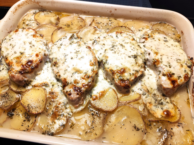 Efter de 40 min., anrettes de brunede koteletter oven på kartoflerne. "Låget" øses over og fadet sættes tilbage i ovnen, uden folie, i 15-20 min.