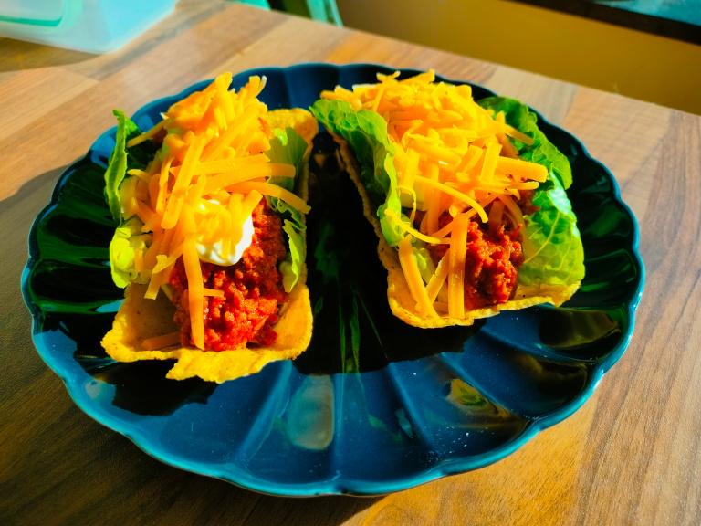 Farsen tilsættes og brunes. Salsa saucen tilsættes og når al væden er fordampet er kødet færdigt.