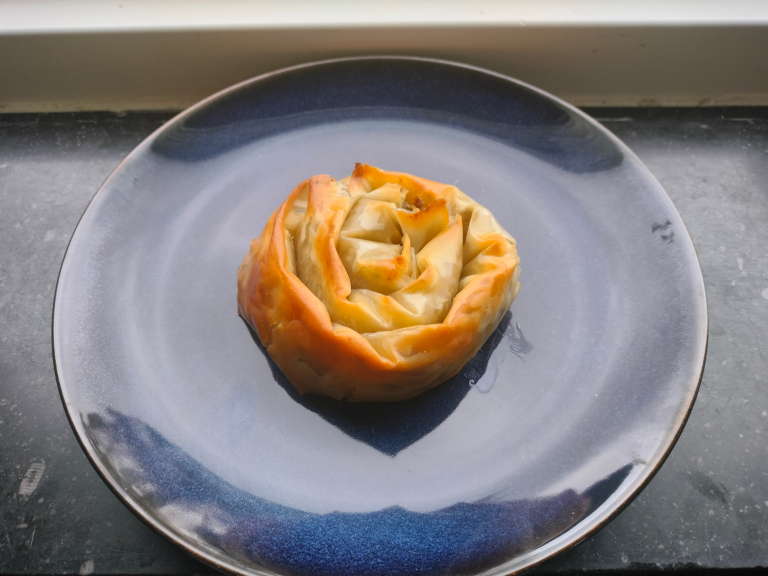 Placer börek på en bageplade, pensl med smør og bag ved 200° i 15-20 min.