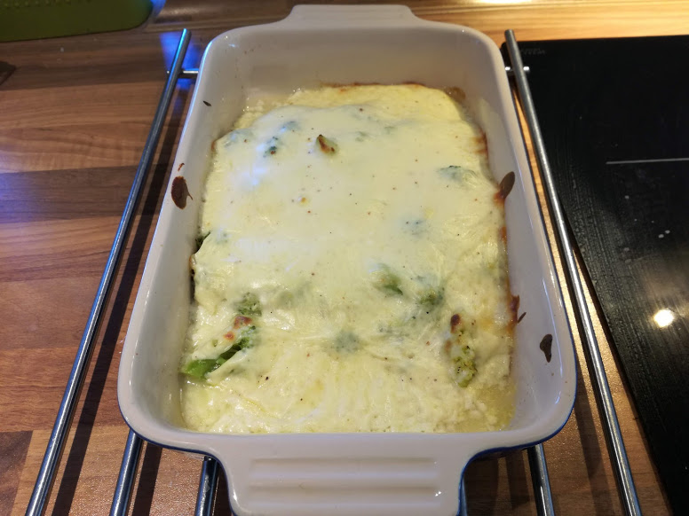 Broccoli fyldes i et ildfast fad, overhældes med bechamelsauce og drysses med rasp. Stilles i ovn ved 200° i ca. 15 min.