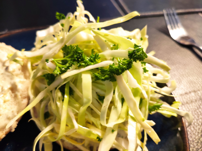 Kål og persille skæres ud i tynde strimler/stykker, og overføres til en skål.