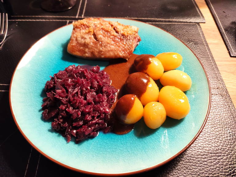Når sukkeret næsten er smeltet, tilsættes smør, og derefter hældes kartoflerne.