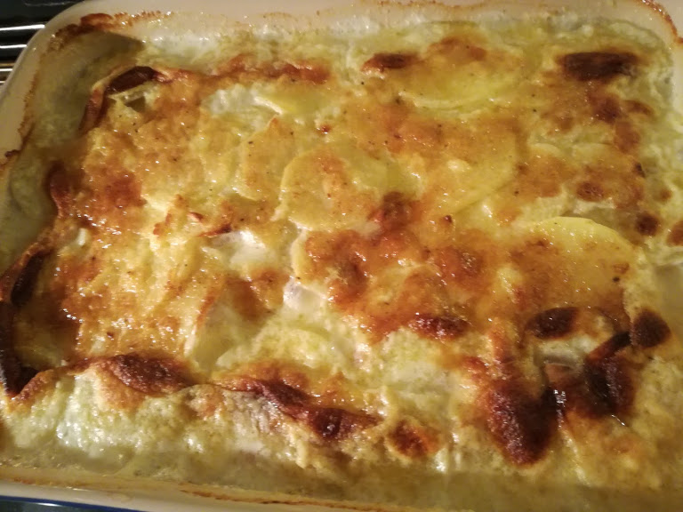 Løg og hvidløg blendes fint sammen med fløden. Salt, peber og muskatnød tilsættes, og flødeblandingen hældes over kartoflerne.