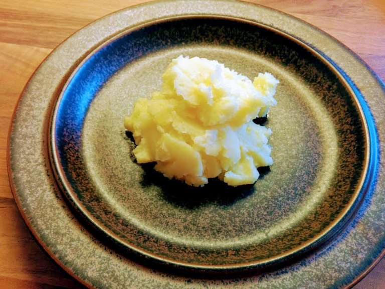 Vandet hældes fra kartoflerne og en lille klat smør tilsættes of så moses der.