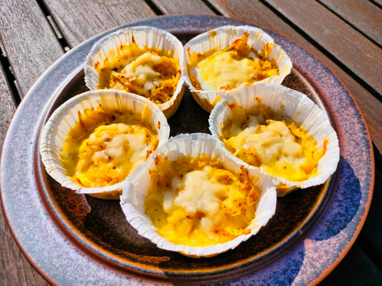 Æg og fløde piskes sammen og fordeles på hver kartoffelmuffin.