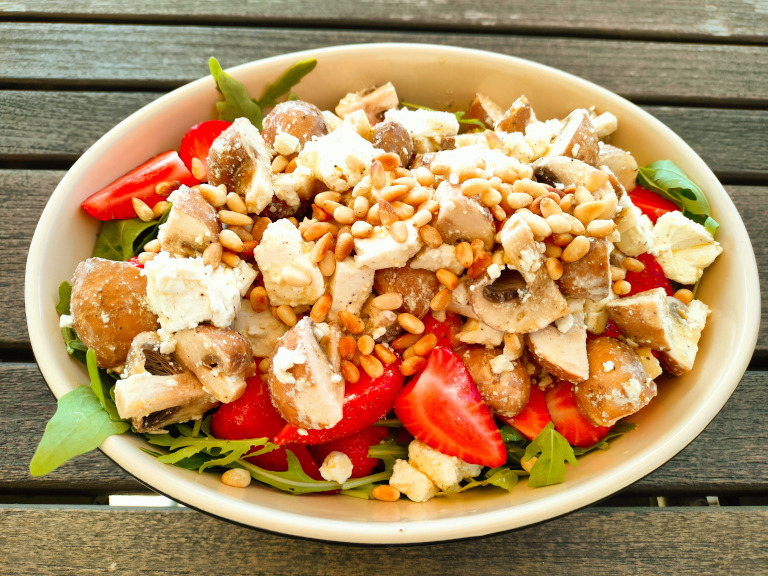 Champignon, fetaen og dressingen fordeles over salaten og til sidst drysses pinjekernerne over.