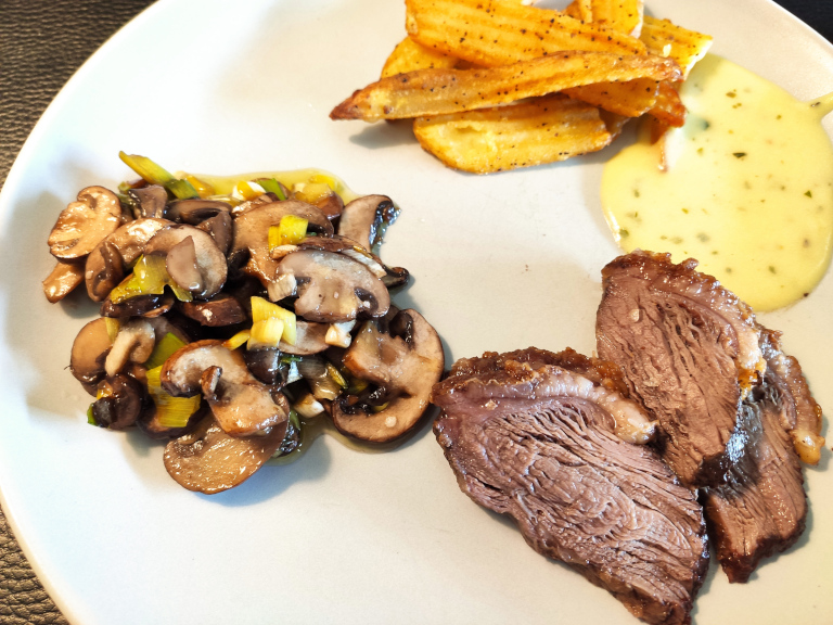 Olie og smør varmes op i en gryde eller på en pande. Champignonerne steges 2-3 min. i fedtstoffet.