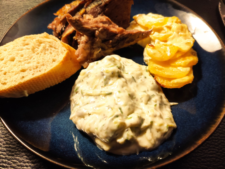 Hvidløgsfeddene pilles, presses og blandes i yoghurten. Ramsløg, olie, citron og dild tilsættes.