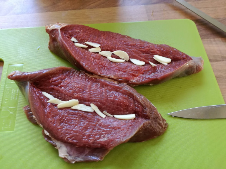 Hvidløg, salt, peber, urteblandingen og smør fordeles inden i kødet, der derefter lukkes så godt som muligt med kødnålene.