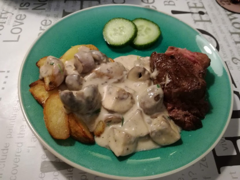 Smelt smør i stegeskyen, og champignonerne svitses heri, til de er bløde og gyldne. Det hele hældes over i en kasserolle.