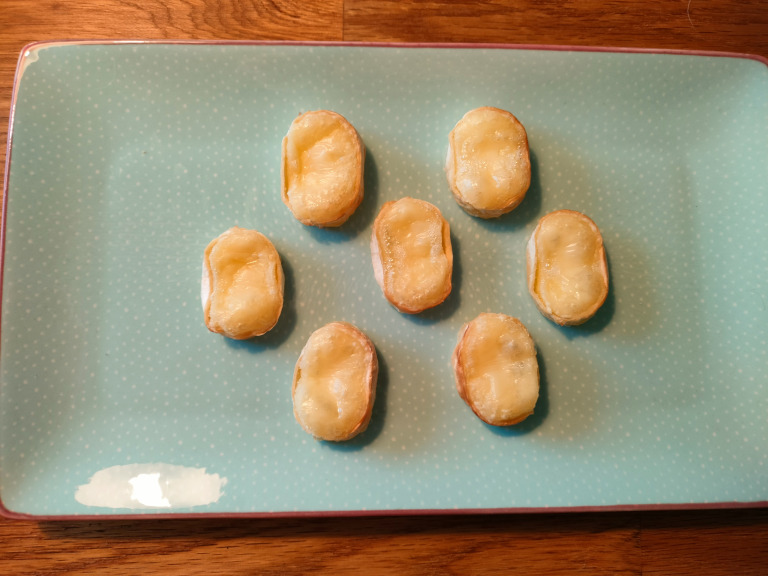 Placer skiverne på et stykke bagepapir og stil i ovn ved 200° i ca. 10-13 min. - indtil skriverne er gyldne.