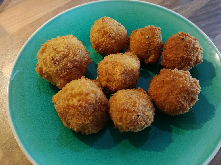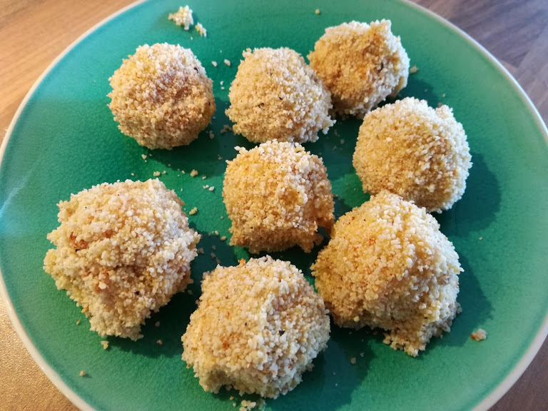 Jeg dobbelt-panerer altid, da det holder bedre på osten, så jeg gentager ægge- og raspdypningen.