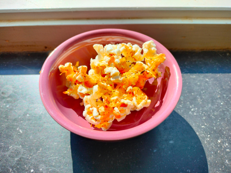 Drys osteblandingen ovenpå popcornene.