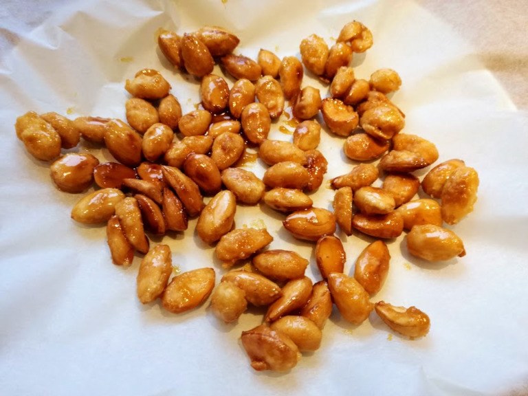 FremgangsmådeStart med at lægge det hele i en pande, sæt komfuret på høj varme. Så skal man bare røre rundt i mandlerne indtil at mandlerne har fået en gyldenbrune farve. Når de har fået den gyldne farve skal du lægge dem ud på et stykke bagepapir og lade dem køle af.